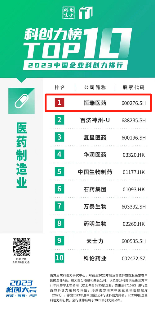 近日,南方周末科创力研究中心发布了与居民日常生活密切相关的30个行业中科创力排名前10的企业榜单。k8凯发天生赢家·一触即发医药凭借多年来在科创领域的大力投入和优秀成果,蝉联中国企业科创力排行医药制造业榜首。