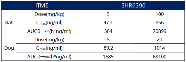 在临床前的动物实验中,达尔西利表现出较好的抑瘤效果,而且剂量效应明显。临床前研究显示,大鼠和犬体内,升高药物剂量时,达尔西利血药浓度随之升高(表2)。与血浆的药物浓度相比,达尔西利在肿瘤组织中的分布比例更高。这些良好的药代吸收特性为其毒理评价与药效模型评价都打下坚实的基础。