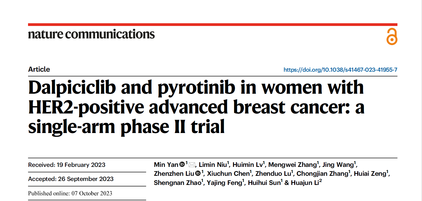 1.Min Y, et al. Dalpiciclib and pyrotinib in women with HER2-positive advanced breast cancer: a single-arm phase II trial. Nat Commun 14, 6272 (2023).