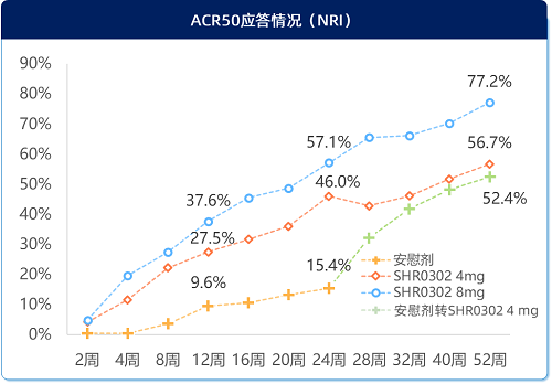 艾玛昔替尼治疗2周,可明显改善CDAI和SDAI。与安慰剂相比,SHR0302 4mg和8mg在第2周就显著改善患者CDAI和SDAI,且8mg组改善更好,持续改善至52周(图2)。