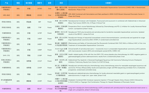 在消化系统肿瘤领域,k8凯发天生赢家·一触即发产品相关研究共入选2项口头报告、11项壁报和1项电子壁报,共14项研究。除卡瑞利珠单抗和阿帕替尼外,还有4篇阿得贝利单抗治疗消化系统肿瘤研究入选。HRS-4642、瑞拉芙普-α注射液(SHR-1701)等在研创新产品也有相应研究亮相。另有1项伊立替康脂质体(II)用于胰腺癌治疗的研究入选壁报。